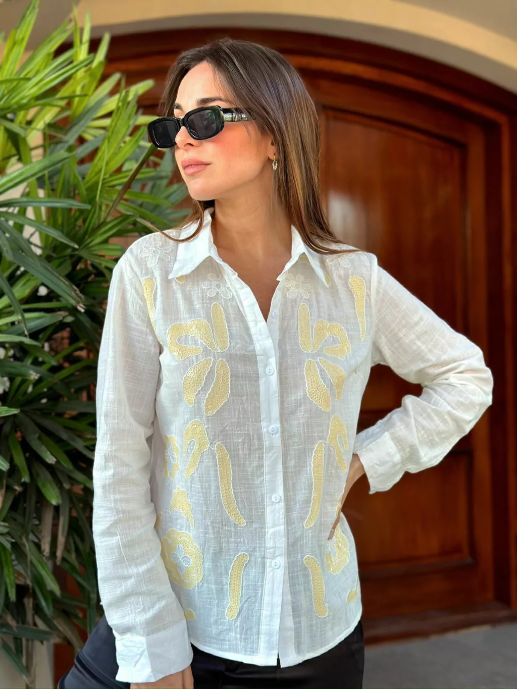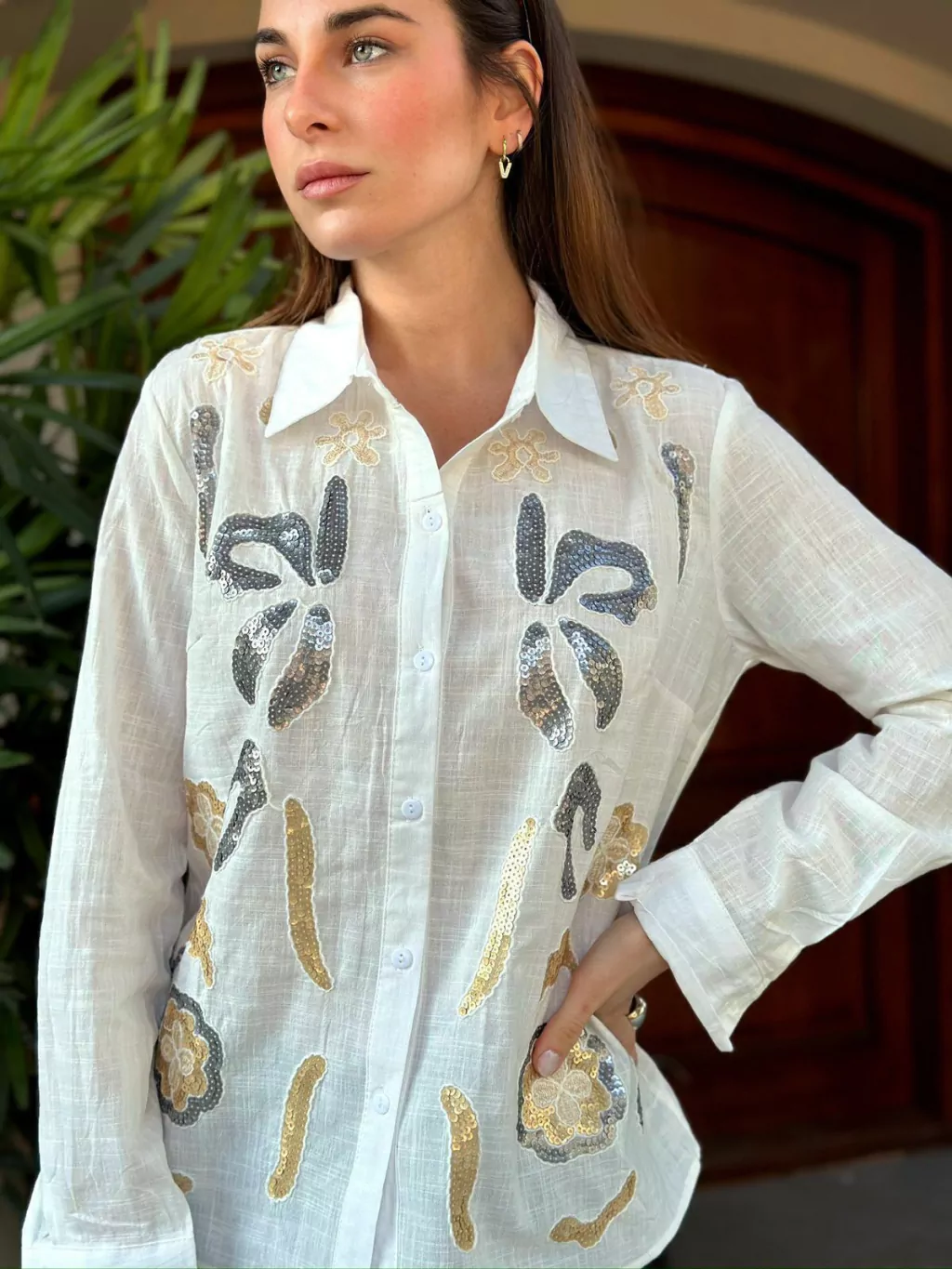 Camisa Premium de Lino con Lentejuelas. Medidas Aproximadas: Talle S Sisa 50 cm Largo 59 cm, Talle M Sisa 52 cm Largo 60 cm, Talle L Sisa 54 cm Largo 61 cm y Talle XL Sisa 56 cm Largo 62 cm.