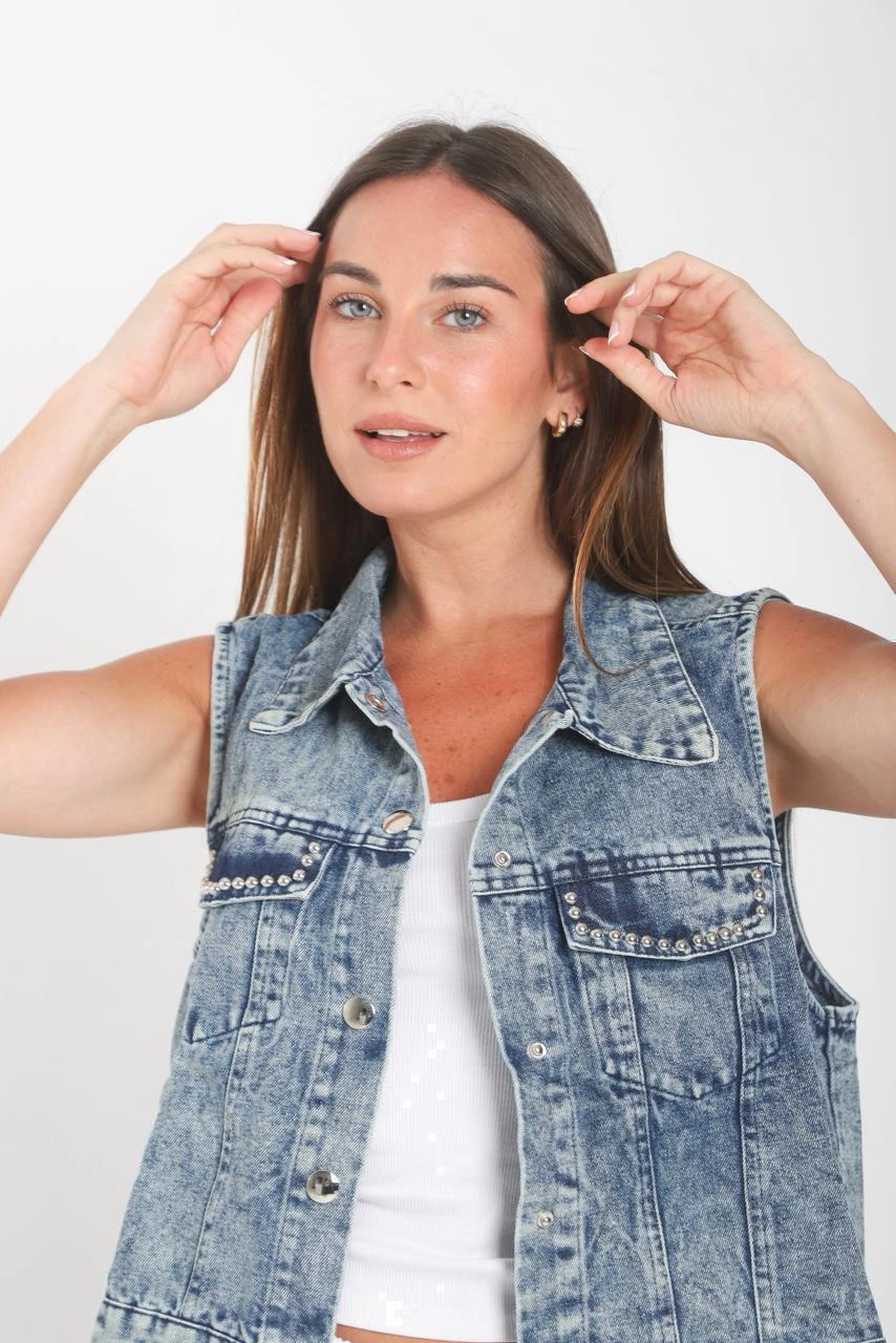 Chaleco de jean nevado con aplicacion de tacha bombe en bolsillos