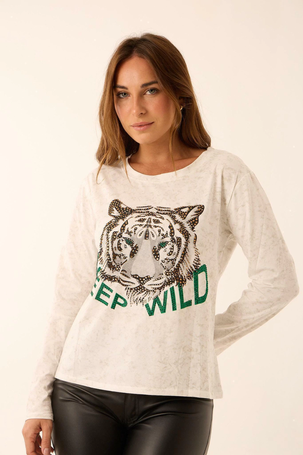 Remera Premium Batik Manga Larga Estampada con Strass. Medidas Aproximadas: Talle S Sisa 46 cm Largo 57 cm, Talle M Sisa 48 cm Largo 58 cm y Talle L Sisa 50 cm Largo 59 cm.